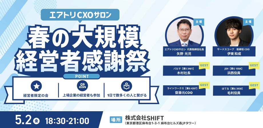 🧑‍💼 経営者大新年会 今回はプライム上場企業の株式会社エアトリ(TYO: 6191)様とのコラボ経営者会になります。 ゲストには上場企業の創業者や経営層の方々が参加予定で... powered by Peatix : More than a ticket.