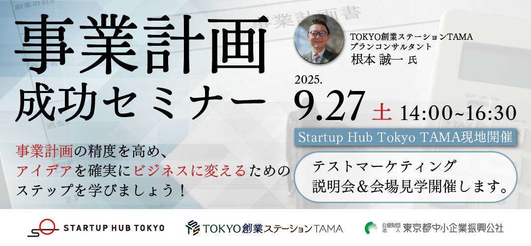 あなたの事業計画の精度を高め、アイデアを確実にビジネスに変えるためにテストマーケティングは有効な手段です。 本セミナーは、事業計画作成の上で欠かせない要素(ターゲット顧客、市場分析、競合分析など)、テストマーケティングを活用して計画を具体化する手法を解説します。 よくある失敗例も交え、テストマーケティングの成功事例、具体的な手法についてプレゼンテーションを行い、質疑応答を通じて参加者の疑問を解決します。 さらに、プランコンサルティングにおけるテストマーケティング調査支援の概要を説明し、現地相談会で直接相談できる場を設けます。 【 イベントの流れ 】 登壇者: 根本誠一 様、 公社担当者様 司会:Startup Hub Tokyo TAMAスタッフ 1.本日のテーマ、イベント趣旨の説明 2.TOKYO創業ステーション施設紹介( 紹介動画 + TOKYO創業ステーション施設役割・サービス等を説明) 3.セミナー 【第1部】 ▼事業計画を成功に導くためのテストマーケティングの活用法 (登壇者:根本 氏) ∟事業計画の重要性とテストマーケティングの役割 ∟成功事例の紹介 ∟具体的な手法とプラン作成のポイント ∟質疑応答 ▼テストマーケティング調査支援概要説明(登壇者:プランニングポート担当者) ∟支援内容の詳細説明 ∟質疑応答 【第2部】*当日現地参加者対象 ▼現地相談会(プランニングポート担当者、Startup Hub Tokyo TAMAスタッフ) ∟テストマーケティング会場見学 ∟参加者が個別に相談できる時間を提供 ∟専門家によるアドバイス