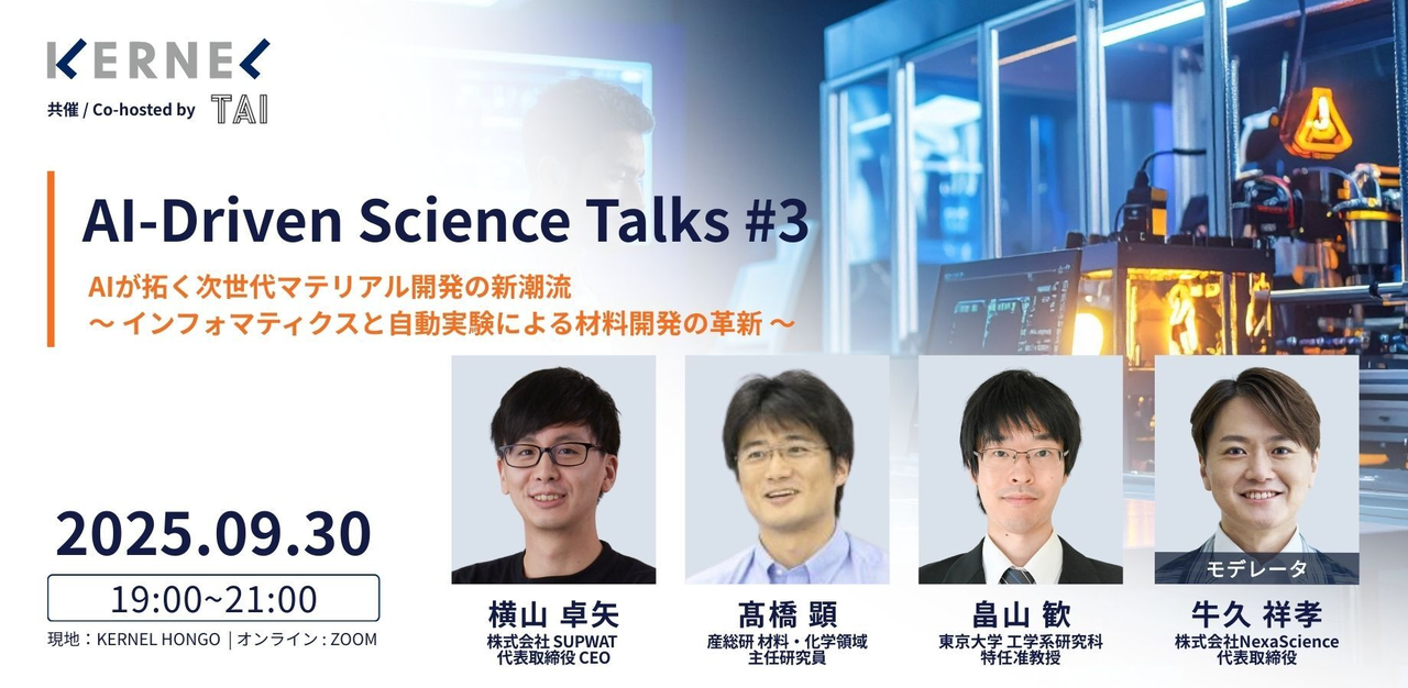 AI-Driven Science Talksは、AIを研究・開発に取り入れている研究者・事業家をお招きし、科学・技術の未来を形づくる最前線のトピックを深掘りするシリーズ企画です。第三回となる今回は「AI×材料」をテーマに、研究現場・技術開発・ビジネス応用のそれぞれで活躍する登壇者と共に、AIが材料開発の現場をどう変革し、産業や事業に何をもたらしているのかを議論します。 本イベントでは、AIによるインフォマティクス技術や実験自動化の進展が、材料探索から製造プロセスまでをいかに加速しているかにフォーカスします。材料開発効率化のプロダクトを手がけるスタートアップ、ロボティクスによる自動実験...