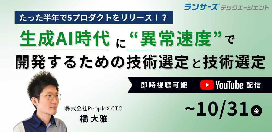 ## 株式会社PeopleX CTO橘氏が語る|半年間で5つのプロダクトをリリースした事例から紐解く、生成AI時代のプロダクト開発で"異常速度"を実現するアーキテクチャ設計・技術選定とは? ※本ウェビナーはITエンジニアとして働く方向けの内容です。 ※3/27(木)に実施したイベントの録画配信になります。 ### 【概要📕】 株式会社PeopleXのCTO橘氏に登壇いただき、アジャイルかつ"AIファースト"な開発プロセスを通じたプロダクト価値最大化の秘訣をお話いただきます。 半年間で5つのプロダクトをスピードリリースした事例から、開発の背景やパフォーマンスを最大化するチーム...