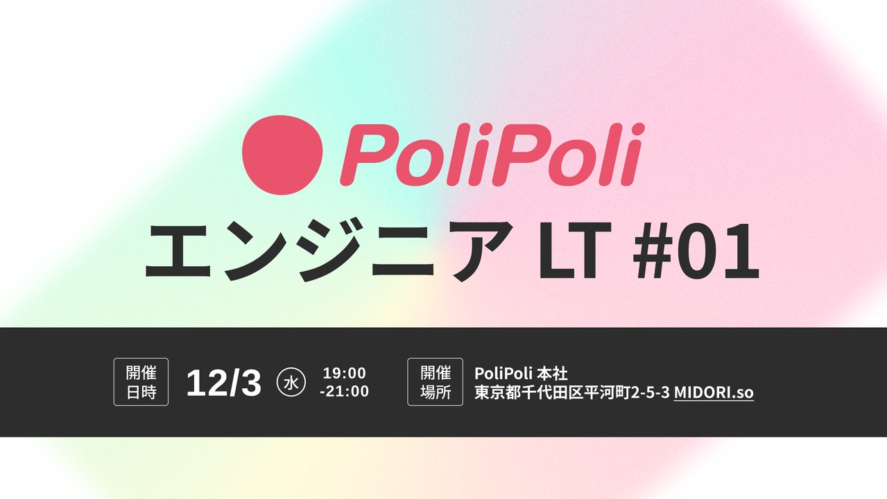 ### ✍️概要 * * * 本イベントは、日頃よりPoliPoliを応援し、ご関心をお寄せくださっている皆様と、直近のプロダクト開発状況や技術的な取り組みを共有させていただくLT交流会です。 エンジニアによるLT形式での発表や、代表者による会社紹介・プロダクトの最新状況を共有し、カジュアルな技術交流を通じて、PoliPoliの「今」を深く知っていただく場とします。 ### ✍️開催概要 * * * * 日時:12/3(水) 19:00〜21:00(受付開始 18:45) * 場所:PoliPoli本社(東京都千代田区平河町2-5-3 MIDORI.so 5F) ...