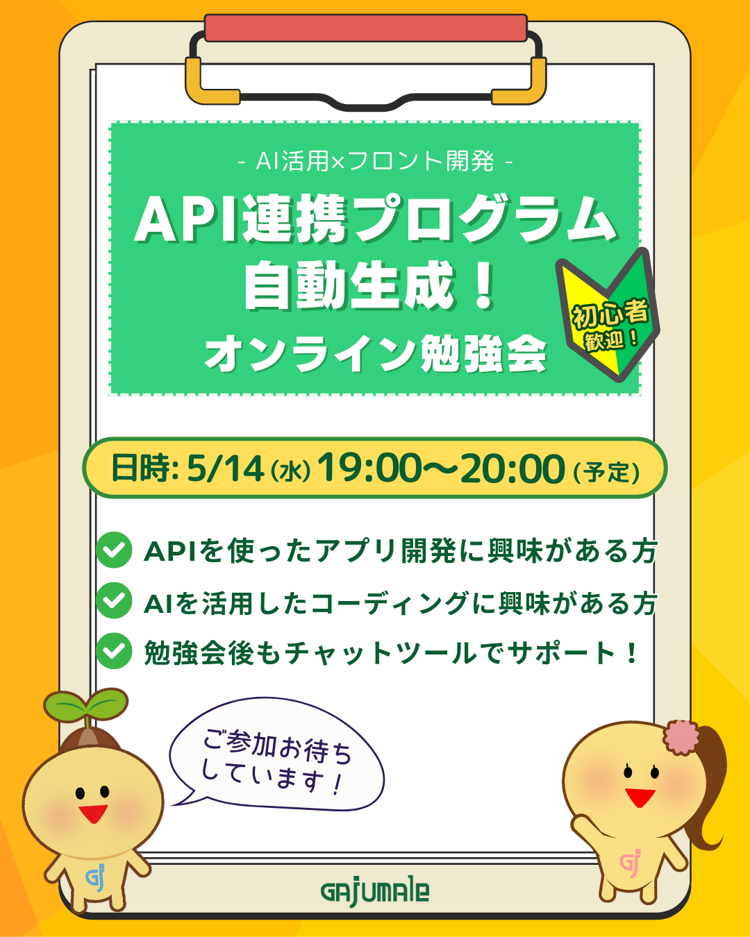 ## 現役Webエンジニアと一緒に、AIを活用したAPI連携プログラムの生成にチャレンジしてみませんか? 本勉強会では、AIエディタ「Cursor」を使い、プロンプト入力による自動コード生成を実践します。 生成されたコードに対して講師による解説や、機能の追加・修正を通じてAIを使った開発プロセスを体感していただける内容です。 「生成AIって実際どう使うの?」「APIを使った開発に興味がある」という方、初参加の方も大歓迎です! わかりやすくサポートしますので、安心してご参加ください。 ### <注意事項> * 事前にAIエディタ 「Cursor」のインストールをお願い...