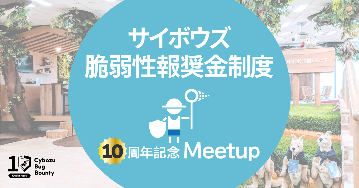 # サイボウズ脆弱性報奨金制度 10周年記念 Meetup ## 概要 「サイボウズ脆弱性報奨金制度」は、おかげさまで10周年を迎え、取り組みは今も進化を続けています。 コミュニティとともに育ててきた10年を振り返り、ハンターと運営がそれぞれの視点で広く学びや印象深いエピソードを持ち寄るミートアップです。 ライトニングトークや交流の時間を通じて、バグバウンティの魅力や文化をオープンに語り合います。 セキュリティに携わる方から、これからバグバウンティに挑戦したい方、サイボウズのプロダクトに関心のある方まで、幅広い参加者に向けた知見共有と交流の場です。 ## 参加枠 50名 ...