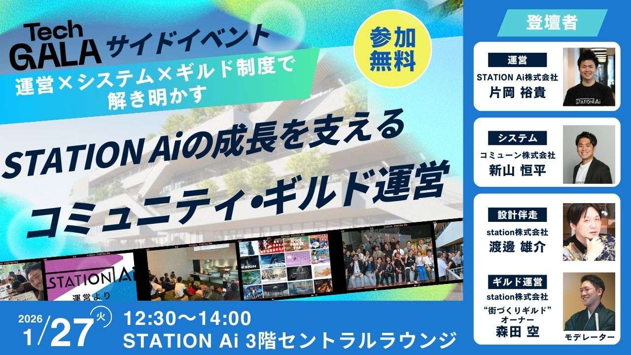 STATION Ai(運営)・Commune(システム)・station(設計伴走)の3社が、開業前/開業期/活性期/自走期の4フェーズに沿って、拡大を支えた設計思想・運用体制・施策(ギルド等)・ツール活用を具体的に紐解きます。