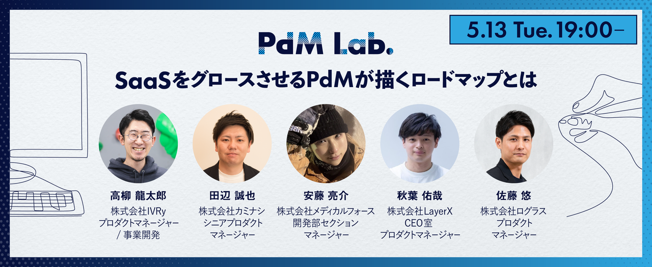 ## はじめに SaaS製品のプロダクトマネージャー(PdM)として日々直面する実践的な課題にアプローチするコミュニティです。現役PdMまたはPdMを目指すエンジニア・デザイナーの皆様に、実務で活用できる知見をシェアしあうことを目的に設立しました。 「PdM Lab.」では、LT大会などのリアルなイベントを通じて、企業の垣根を超えた交流を促し、ナレッジを相互に流通させ、PdMやPdMを目指す人々たちの支援をしたいと考えています。 第一回目のテーマはSaaSをグロースさせるPdMが描くロードマップを掘り下げます。オープニングトークでロードマップの概要をおさらいしたのち、国内SaaSのP...