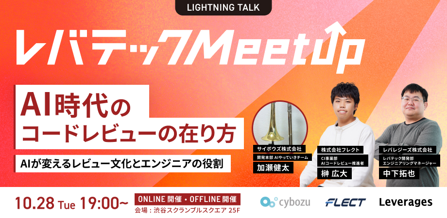 # -レバテック Meetup ~AI時代のコードレビューの在り方~ 本イベントは 👀 第一線で活躍するエンジニア、そして公募枠で選出されたエンジニアたち が登壇し、 「AI時代のコードレビューの在り方」について熱くプレゼンし合うライトニングトークイベントです。 ## 🎤 登壇企業・エンジニア ### レバレジーズ株式会社 中下 拓也様 ##### 「登壇テーマ:次世代コードレビューの実践 ~AIを活用したレビューによる開発現場の変化〜」 前職ではSlerとして月間1億PVを超えるWebメディア開発やloTシステムを構築。 現在はマネジメント業務の合間で開発環境の整備な...