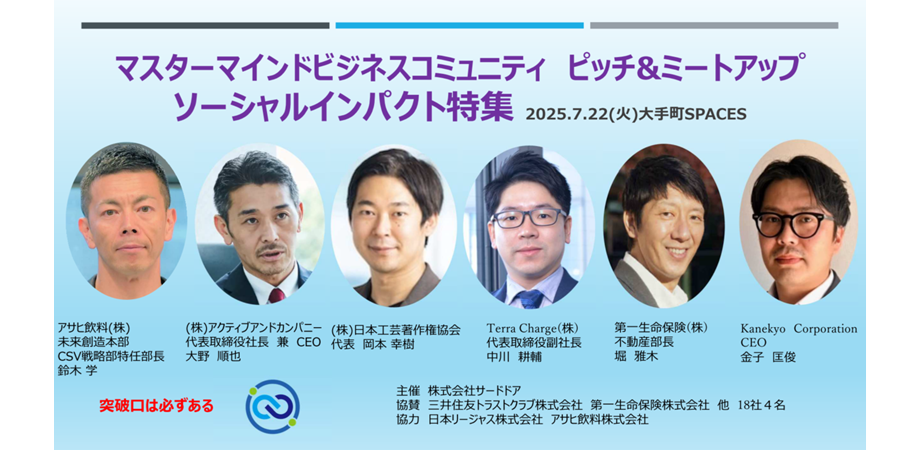 マスターマインドビジネスコミュニティ(主宰:株式会社サードドア代表取締役土橋幸司)は、2025.7.22(火)18時~大手町SPACESにてソーシャルインパクトをテーマにスタートア... powered by Peatix : More than a ticket.