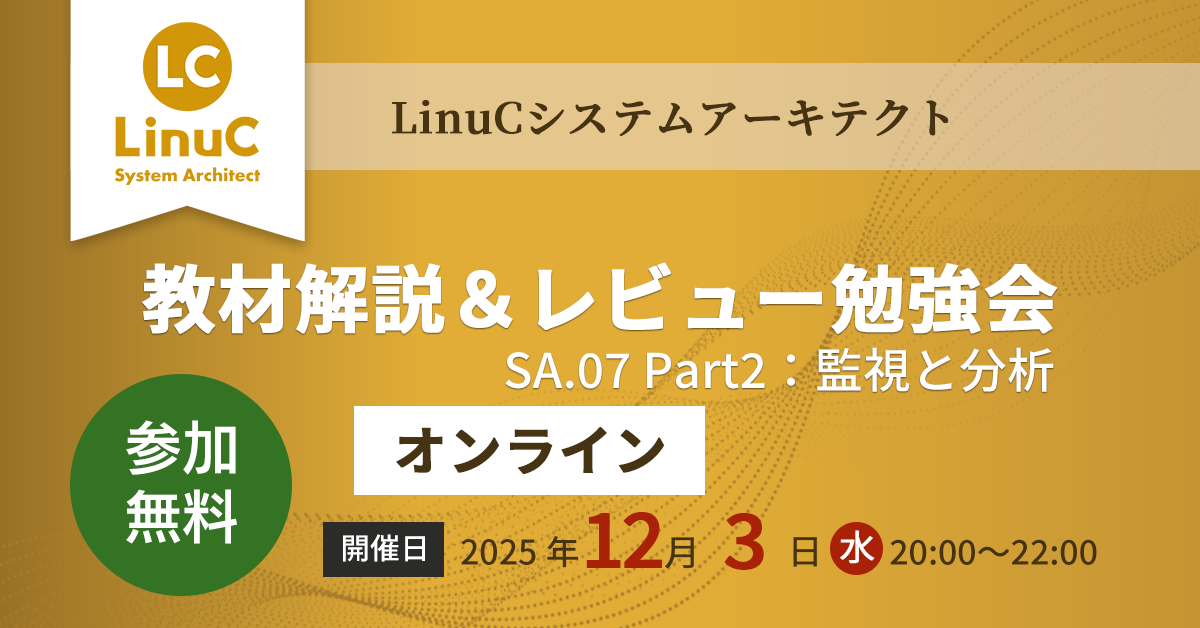 ## イベント概要 本イベントは、ITエンジニアの成長と活躍を促すコミュニティ「LinuC Open Network」が主催するオンラインイベントです。どなたでもご参加いただけますが、事前に「LinuC Open Network」コミュニティ(無料)にご参加をお願いいたします。 勉強会当日の資料はコミュニティのSlackでお渡しします。資料を事前にご一読いただいてからご参加いただきたいため「参加に関しての注意事項」をご参照のうえ、必ず事前にご参加いただきますようお願いいたします。 この度、「LinuCシステムアーキテクト 教材解説&レビュー勉強会」を開催いたします。本イベントでは...