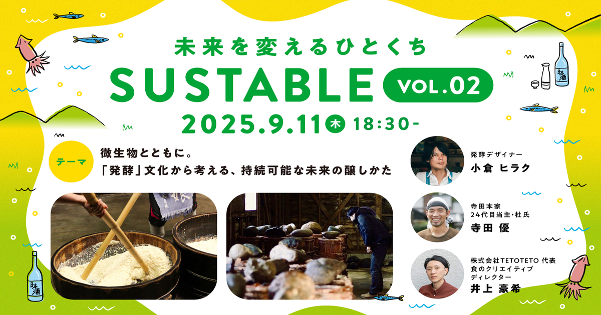 サステナブルフードについて“おいしく・楽しく”学べる『SUSTABLE2025VOL.2』開催のお知らせSUSTABLE(サステーブル)とは、食の「作り手」である生産者、「使い手」であるシェフ、そして「食べ手」である消費者(=聴講者)が集い、毎回、ある「サステナブルフード」をテーマにして、背景にある社会課題を学びながら、実際にサステナブルフード食べて、五感で食の未来を考えるセミナーです。日々の食卓