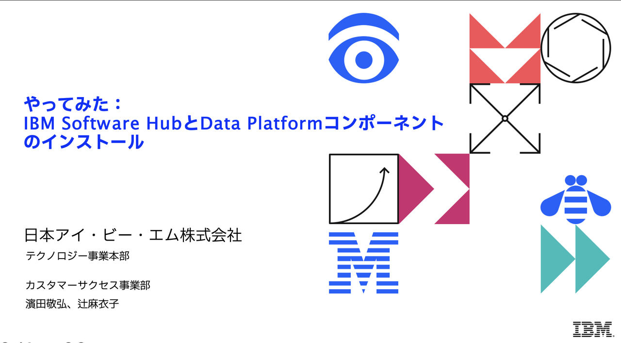 # 概要 30分間のカジュアルなオンライン・セミナーです。Cloud Pak for DataなどData Platform製品のSoftware版のインストールってどんな構成、どんなプラットフォームに、どんなCLIで実施するの?をイメージいただけるかと思います。 背景: 以下のドキュメントをなぞりながら、IBM Software HubとData Platform関連モジュールを実際のコマンドラインの実行の流れをご紹介できれば、Software版を使ってみるイメージをお持ちいただけるかと思います。 参考ドキュメント: https://www.ibm.com/docs/ja/sof...