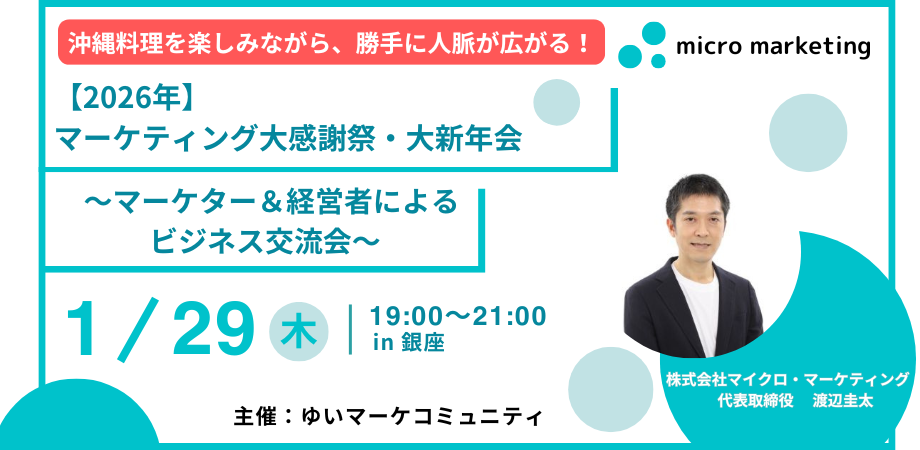 主催者紹介株式会社マイクロ・マーケティング代表取締役渡辺 圭太(わたなべ けいた)金融業界で培った独自のマーケティングノウハウを活かし、2021年8月に株式会社マイクロ・マーケティングを設立。ホームページやECサイトなどのWEB制作、その後のWEB集客まで「一気通貫したマーケティング支援」を得意とする。次世代の起業家を応援すべく、創業期のマーケティング支援を行なっている。会社経営の傍ら、マーケターコミュニティ「ゆいマーケ」の主催もしている。現在は沖縄にも拠点を作り、東京と沖縄の2拠点でマーケティング活動を行う。沖縄の魅力をマーケティングの力で広めるべく、日々奮闘している。最近の趣味はゴルフとスクーバダイビング。<イベント概要・お申込み>
