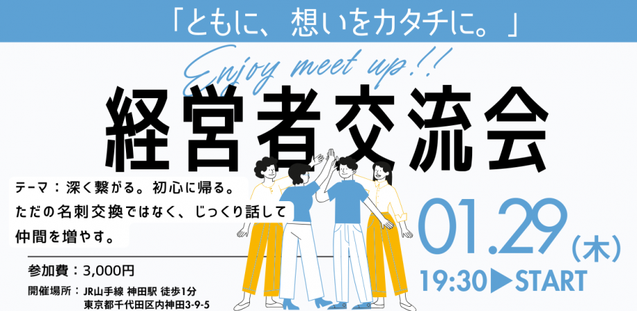 「ともに、想いをカタチに。」~深く繋がる。初心に帰る~ 経営者・創業者・フリーランスなど、挑戦を続ける人を支えたい。これは我々の成し遂げたいことです。 この会は、ただの名刺交換で終... powered by Peatix : More than a ticket.