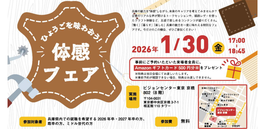 イベント詳細 ★企業のリアルな声をきくことができるトークセッションを実施★姫路の皮革を使ったレザークラフトを体験できる★兵庫の「働く」「暮らす」「楽しむ」を一度に体験できる兵庫県の魅力を”体感”しながら、未来のキャリアを考えてみませんか?企業のリアルな声が聞けるトークセッションや、姫路レザーを使ったクラフト体験など、五感で楽しめるコンテンツが盛りだくさん。「働く」「暮らす」「楽しむ」兵庫の魅力を一度に味わえる特別なフェアです。今だけのこの機会、ぜひご参加ください!イベント詳細・事前予約についてイベントの詳細は下記リンク先から確認できます。https://questant.jp/q/0130hyogo_taikanfair■来場者特典事前にご予約いただいた来場者全員に、Amazonギフトカード500円分※プレゼント※特典は当日会場にてお渡しいたします。※特典内容は変更となる可能性があります。■参加対象者兵庫県内での就職を希望する2026年卒・2027年卒の方、既卒の方、ミドル世代の方■参加費無料■定員20名※会場の収容人数には限りがございます。事前予約いただいた方を優先してご入場いただきます。予約なしでお越しの場合、入場をお断りする場合がございますので、あらかじめご了承ください。■当日のスケジュール17:00~17:15 「ひょうごで働こう!社会人インターンシップ」のご案内17:15~17:45 ひょうごのしごとコラボトークセッション17:45~18:45 レザークラフト体験※ご希望の方は軽食つきで体験いただけます。■実施内容◇ひょうごのしごとコラボトークセッション「兵庫県のしごとの魅力」「兵庫県の住まい・生活の魅力」等をテーマに、兵庫県内企業2社によるパネルディスカッションを実施いたします。~出展企業詳細~株式会社加美乃素本舗加美乃素本舗は、1908年創業の老舗ヘアケアメーカーです。育毛剤「加美乃素」をはじめとする医薬部外品・化粧品・ヘアケア商品を、自社で研究開発から製造・販売まで一貫して行っています。長年にわたる毛髪・頭皮研究に基づく技術力と信頼を強みに、国内外の幅広いユーザーの悩みに応えながら、これからも“美と健康”を提供します。ハートスフードクリエーツ株式会社ハートスフードクリエーツ株式会社は、「食で笑顔を届ける」をモットーに食で人と社会を支える事業を展開して