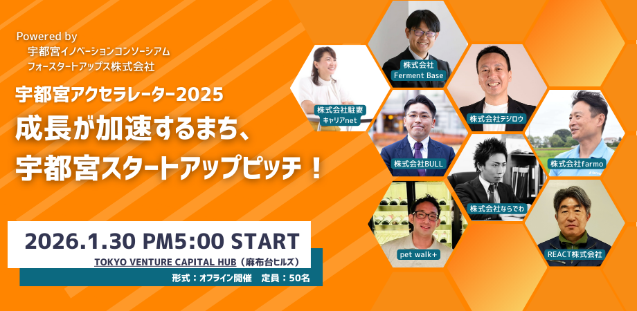 【参加無料・事前登録制】 席数に限りがございます。成長企業との出会い、そして宇都宮の未来にご関心のある皆様は、ぜひお早めにお申し込みください。 <<<本イベントのポイント>>>①宇都宮を代表するスタートアップが集うピッチ宇都宮を代表するスタートアップが一堂に登壇。宇都宮の未来を担う熱量の高いピッチにご期待ください。 ②濃密なネットワーキング多くのVC/CVC、大企業新規事業担当者様が参加を予定しています。宇都宮を代表するスタートアップに加え、地域エコシステム構築にコミットする多様なプレイヤーと一堂に出会える、確度の高いマッチングの機会を提供します。