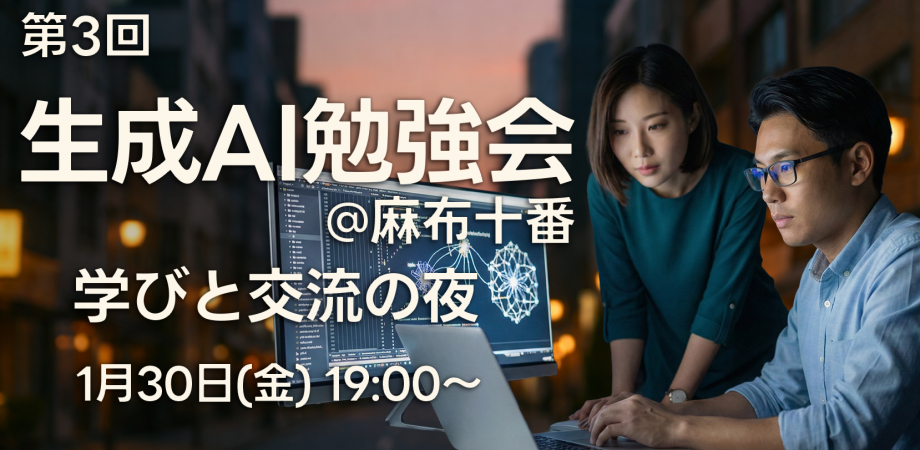 日程:1月30日(金) 時間:19:00〜22:00(飲み放題・軽食あり)会場:麻布十番会員制ラウンジ 麻布十番駅徒歩2分(住所非公開のため申込後に住所をご連絡します。)対象: ChatGPT / Claude / Geminiなど生成AIを普段から使っている方