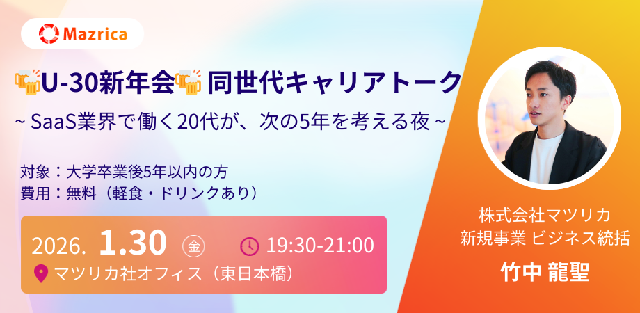 日時: 2025年1月30日(金)19:30〜21:00(受付開始 19:15〜) 場所: マツリカ オフィス(東京都中央区東日本橋2丁目7番1号 FRONTIER東日本橋 6階) 内容: プロダクト紹介+職種紹介セッション+セールステック体験+カジュアル懇親会(ドリンク・軽食あり) 定員: 20名程度 対象: 大学卒業後5年以内の方 参加費: 無料持ち物:名刺(会社から貸与されているものがある場合) 特典: 希望者は後日、当社の選