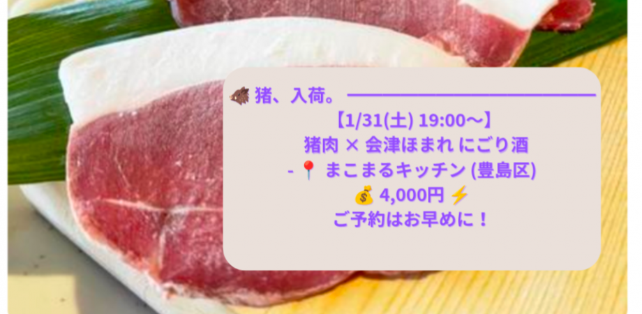 【1/31(土)夜】猪肉×にごり酒。ヘルシーで美味しい「猪肉」の概念が変わる夜 「猪肉って、クセが強そう…」 そういうイメージありますか⁉️ 実は猪肉は、... powered by Peatix : More than a ticket.