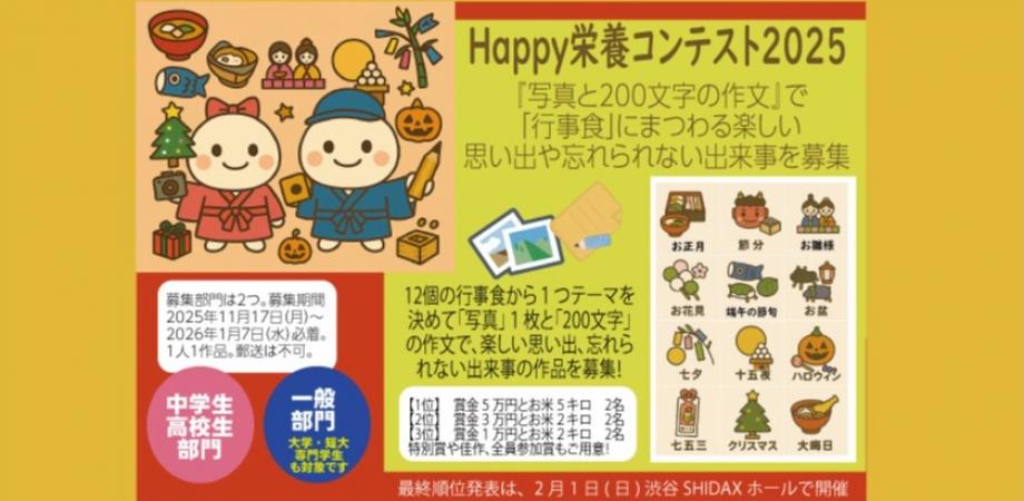 『写真と200文字の作文』で「行事食」にまつわる楽しい思い出や忘れられない出来事を募集!「Happy栄養コンテスト2025」(主催:一般社団法人 全国栄養士養成施設協会)を開催。募... powered by Peatix : More than a ticket.