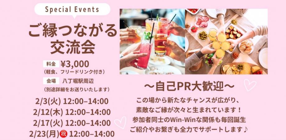 イベント詳細 【ご縁が繋がるランチ会について】ご飯を食べながら、交流をして仲間を作ったり、人脈を広げたりなどを目的としたイベントで、比較的女性が多くいつも10名から20名が参加されています。 【こんな人におすすめのイベントです】・気軽に参加できる交流会に興味がある・仕事の合間や休日に楽しい時間を過ごしたい・友人、人脈を増やしたい・美味しいご飯が食べたいこんな思いにこたえる交流会です!もちろん「目的は特になし、ただ参加してみたい」人も大歓迎です!【参加料金】3000円(税込)※軽食、フリードリンク付き※参加当日の現金払い【会場】東京都中央区八丁堀2-1-9川名第一ビル6階 Hanami八丁堀駅,、宝町駅から徒歩4分東京駅から徒歩9分【時間】12:00から14:00途中参加、途中退室OK!①受付開始 11:45②イベントスタート 12:00③イベント終了 14:00【禁止事項とご利用規約】当会では参加者の皆様に楽しく安全にお過ごしいただくため下記の禁止事項を設けてます。参加者の皆様は、参加者間、参加者と当会スタッフ間において、パワハラやセクハラ、暴言、大声、差別的な発言、悪口、嫌がらせ、いじめ、過度な勧誘や営業、執拗に連絡先を聞く事、進行の妨害、チラシ配布をすることはできません。参加者から複数のクレームが起きた場合は理由の如何を問わず以後のご参加をお断りします。また理由等の説明をいたしません。【中止について】地震、台風などの災害や悪天候時には皆様の安全を確保するために当社の判断により当会は中止されます。中止の場合はメールにてご連絡させていただきますので、極端に天候が悪い時は確認してください。【免責事項】当運営では当会の予約、参加、中止等で起きる事故、トラブル、損害について保証することはありません。また参加者間で起きた係争等に仲裁に入ることはありません。【よくある質問】Q. 持ち物はありますか?A. 参加料金だけお持ちしていただければ手ぶらでも参加可能ですが、持ち込みも可能です。Q. 連絡先交換はできますか?A. 個人的に連絡を取り合っていただいて問題ございません。※運営スタッフの一部を除きますQ. キャンセルできますか?A. キャンセル可能です。Q. ドタキャンにペナルティーはありますか?A. 無断キャンセルが多い方は以後のイベントへご参加をお断りする場合があります。