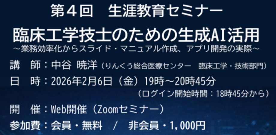 2025年度 第4回生涯教育セミナーテーマ:「臨床工学技士のための生成AI活用」開 催 日:2026年2月6日(金)開催時間:19:00~20:45(内15分質疑応答)開催形式:Web(Zoom Webinars)参 加 費:会員・学生:無料、非会員:1,000円講師:りんくう総合医療センター 中谷暁洋 先生