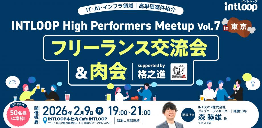 大人のための、上質でカジュアルな交流空間開催日は「肉の日(2月9日)」。当日は、INTLOOPのフリーランス向け福利厚生サービスでも高い評価を得ている〈格之進〉より、厳選されたお肉、こだわりのハンバーグをご用意。堅すぎず、くだけすぎない演出で、実務経験豊富なフリーランス同士も自然に会話できる空気感を大切にしています。「世界で一番お肉に真剣なブランド」を目指す「格之進」公式サイト:https://kakunosh.in/