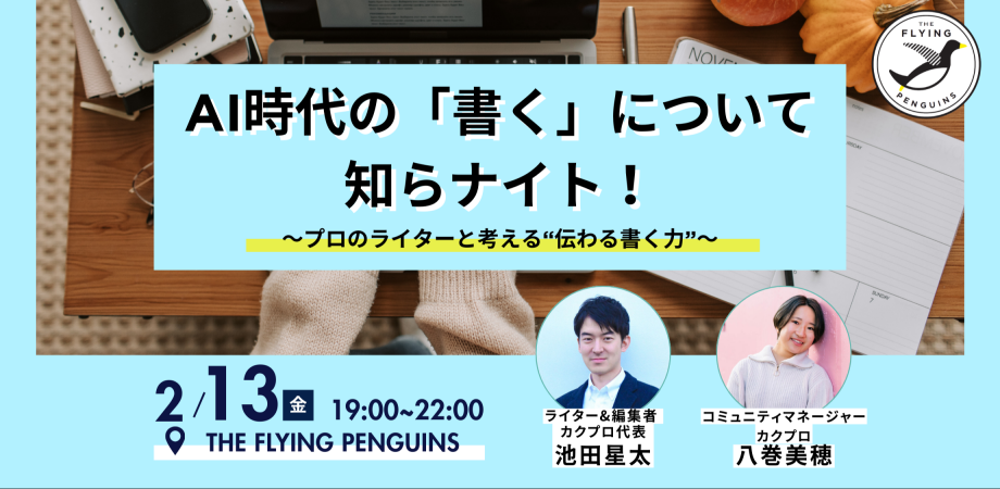 「書く」仕事がAIで激変している今、プロのライターはどう向き合っているのか。この日のフラペンは、ライターのプラットフォームをつくる池田星太さんと、コミュニティマネージャーの八巻美穂さんをお迎えして、「書く×キャリア」をテーマにした夜をひらきます🐧
