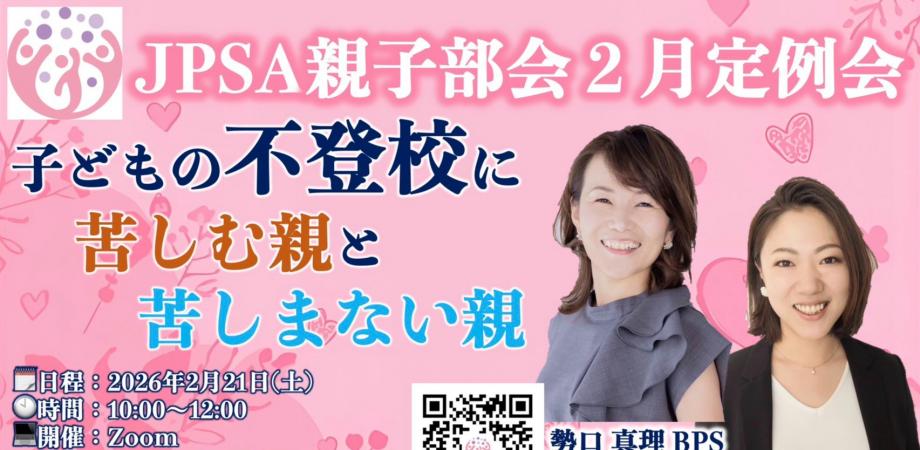 🌱JPSA親子部会 2月定例会🌱 テーマ:「不登校」 JPSA親子部会 運営より勢口真理BPS・二橋佐知APS が登壇🎤 🗓日程:2026年2月21日(土)🕙時間:1... powered by Peatix : More than a ticket.