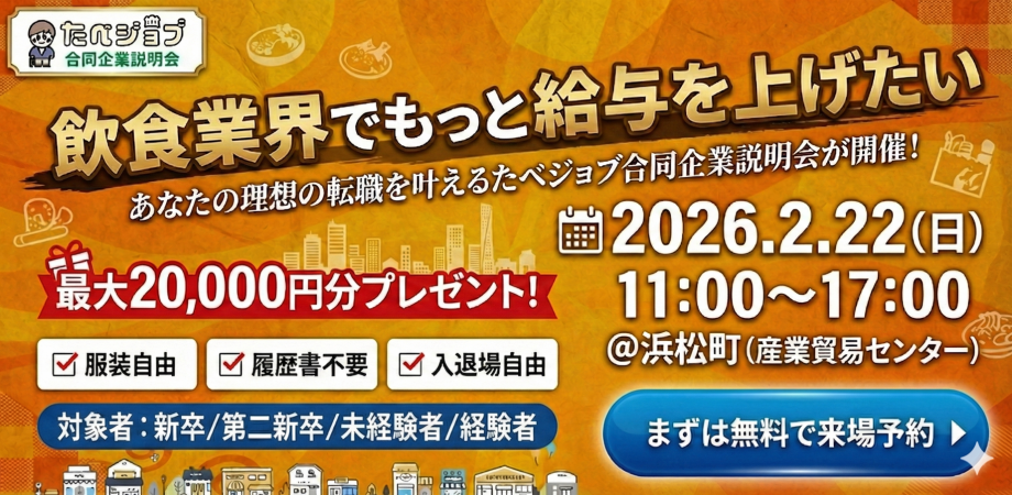 ▶イベントの事前予約はこちら(30秒で完了)https://jobfair.tabeloute.co.jp/?cv=mim695ca1077044d
