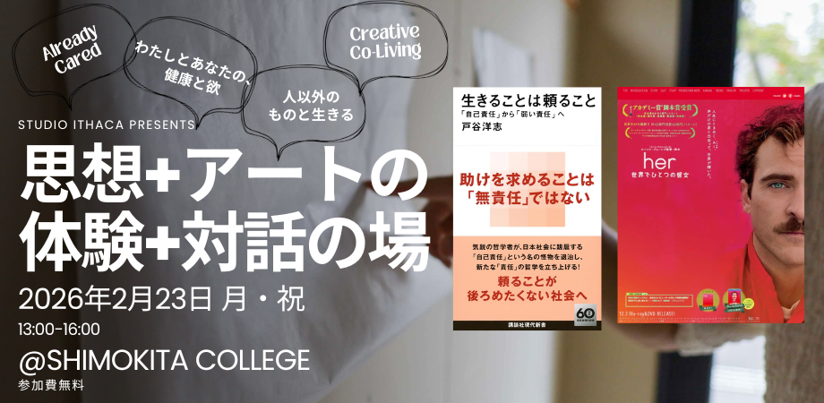 となっています。参考資料として、戸谷 洋志さんの『生きることは頼ること』と、映画『her/世界でひとつの彼女』を題材にしていますが、参加者の方が事前に学習していただく必要はありません。