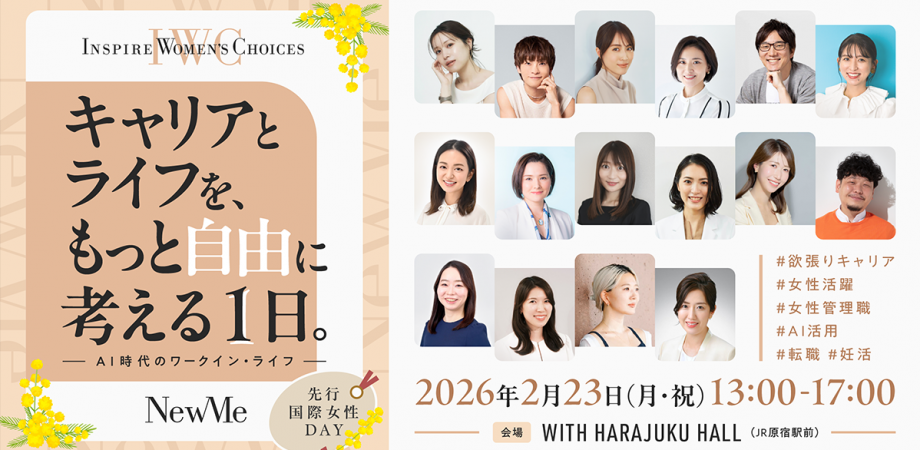 ■開催概要名称:Inspire Women’s Choices開催日時:2026年2月23日(月・祝)13:00~17:00形式:会場参加(オンライン参加は1月19日より受付開始)会場:WITH HARAJUKU HALL(JR山手線原宿駅前)参加費:3,800円、税込み(抽選制)