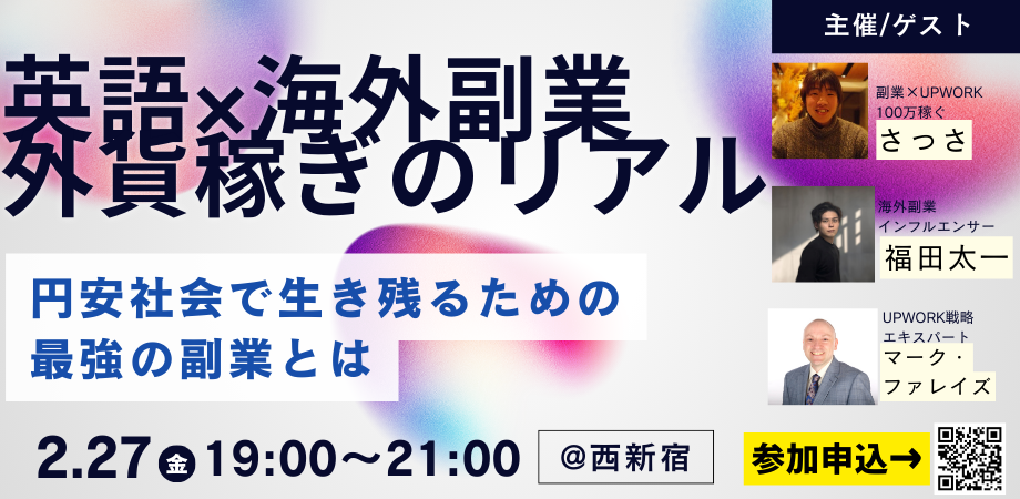 実際に海外クライアントから案件を獲得し副業を行っている「さっさ」、海外副業のインフルエンサーとして活躍する「福田太一」をゲストに招き、ワークショップと交流会を開催します。