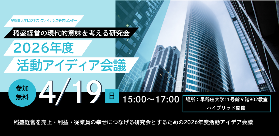 ------------------------------------------------------------------------------------------------ 概 要-------------------------------------------------------------------------------------------------日 時:2026年3月1日(日)13:00ー18:00主 催:早稲田大学ビジネス・ファイナンス研究センター「稲盛経営の現代的意味を考える研究会」場 所:早稲田大学11号館9階902教室 〒162-8050 東京都新宿区西早稲田1-6-1対象者:研究会会員限定(受講希望者は研究会への入会が必須)定 員:50名申込締切:2026年2月13日 研究会未入会の方は会費請求書をお送りいたしますので、 2/24までに年会費(10,000円)のお振込みをお願いいたします。