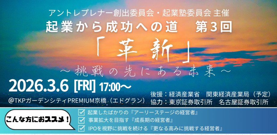 開催概要日時:2026年3月6日(金)17:00〜21:00会場:TKPガーデンシティPREMIUM京橋(京橋エドグラン21階)住所:〒104-0031 東京都中央区京橋2丁目2−1 京橋エドグラン21階参加費:1万円(税込)※お食事・ドリンク付き対象:NBC会員・ゲスト来場予定:300名以上(経営者・士業・金融関係者〔証券会社・監査法人等〕ほか)主催:NBC アントレプレナー創出委員会・事業成長促進委員会協力:東京証券取引所/名古屋証券取引所後援:経済産業省/関東経済産業局(予定) タイムスケジュール※昨年度同一構成(変更の可能性あり)17:00〜 開会/主催者挨拶・ご来賓挨拶(東証・名証)17:30〜18:15 基調講演(45分)18:15〜 パネルディスカッション①19:10〜 パネルディスカッション②20:00〜21:00 大交流会(ドリンク・お食事付き) おもな登壇者(予定)次世代リーダーとして、これからの日本経済をけん引する経営者山中大介氏(SHONAI)、柳澤孝一氏(栄農人)、近藤佑太朗氏(Unito)をはじめ、NBCの上場オーナー経営者として、青木正之氏(Ubicomホールディングス)、有本隆浩氏(MS-J
