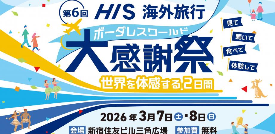 ♪ イベントを楽しむ ポイントをご紹介 ♪その1|メインステージイベント 予定スケジュール各回のゲスト 及び 詳細は 第6回HIS大感謝祭特設HPにて(リンク) 随時発表いたします。【2026年3月8日(日) 開催】 ⑨09:50~ 鉄道で巡るヨーロッパ行くと決めた日から、旅は始まる。「旅の計画」のワクワク感から旅立ちまで旅作家と語る、父娘旅のストーリー⑩10:50~ シンガポール人気アナウンサー宇賀なつみさんが+1のシンガポールの過ごし方について語ります!⑪11: