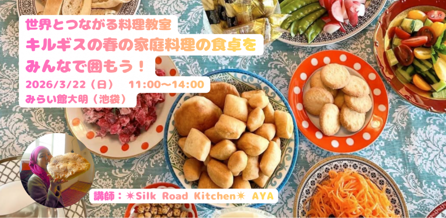 イベント詳細 毎回、大人気の「世界とつながる料理教室」。池袋の「みらい館大明」で、世界各国のまだ食べたことのない料理と出会ってみませんか?今回は、シルクロードの国々の食文化を伝えている✴︎Silk Road Kitchen✴︎ AYAsさんをお呼びし、キルギスの家庭料理の食卓を再現してみんなで楽しみます!湘南産の春の野菜やこだわりの食材をふんだんに利用した華やかな食卓。キルギスの大家族の家庭にお邪魔したような時間を楽しんでください。ボルソック(揚げパン)を作る体験もできます!アゼルバイジャンのチャイ、ワインもあります(ワインはキャッシュオン)