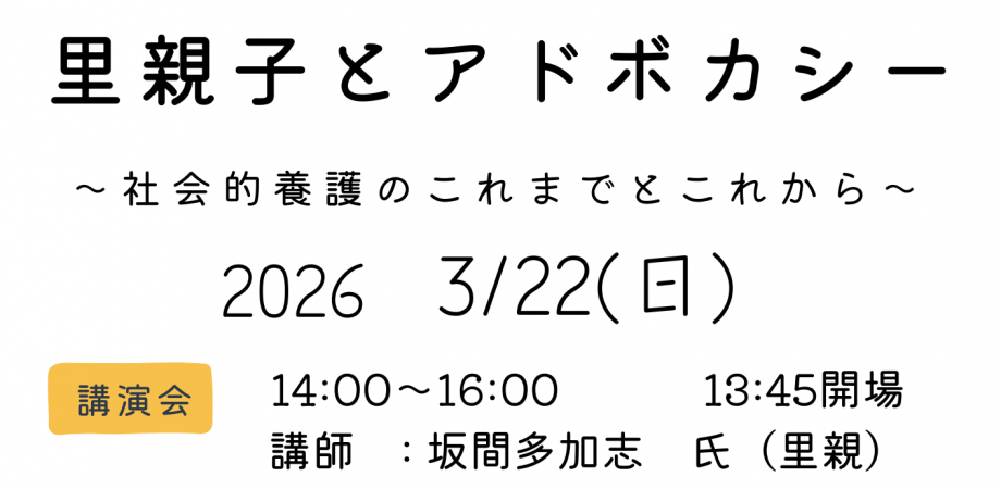 日時:2026年3月22日(日)14時~16時(13:45開場)場所:静岡県男女共同参画センターあざれあ 特別会議室講師:坂間多加志さん(里親)参加費:2000円(正会員無料) ※無料のLINEグループは正会員ではなくサポート会員です。 ※団体会員は2名まで無料です。申込https://adv20260322.peatix.com