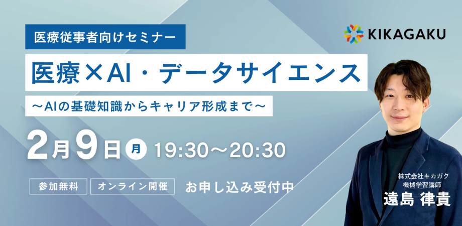 テーマ:医療×AI・データサイエンス〜基礎知識からキャリア形成まで〜日時: 2026 年 2 月 9 日(月)19:30 - 20:30開催場所: Zoom (カメラオフ)参加費用:無料