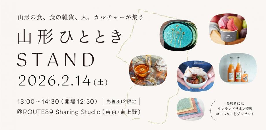 どんなイベント?山形の“いいもの”を味わう、ひとときSTANDへ山形の“いいもの”を味わう「山形ひととき」シリーズの第2回。山形から、食べもの・飲みもの・食の雑貨など“いいもの”が集まり、東京・上野エリアで楽しむ1日です。素材の味わいはもちろん、つくり手の工夫や背景にも触れられる時間をお届けします。当日は、山形食材を使った洋風軽食ランチプレートを囲みながら、山形の果実を使った製品のつくり手2組のゲストトークをお楽しみいただきます。会場には、山形のクラフト酒やクラフトジュースを楽しめるドリンクスタンドもご用意。イベント終了後には一部食品の販売も予定しています。先着30名限定。参加者全員に〈ケンランドリネン〉特製、リネン100%コースターをプレゼントします。
