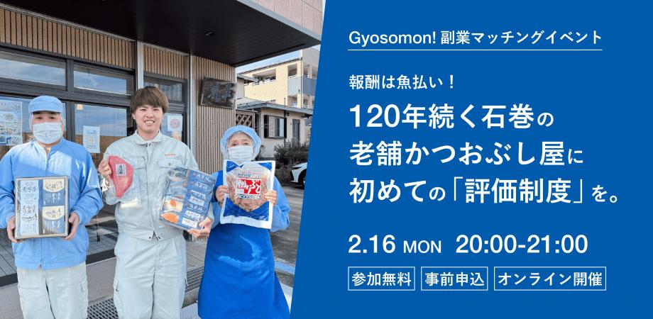 イベント詳細 報酬は魚払い!120年続く石巻の老舗かつおぶし屋に、初めての「評価制度」を。 水産業特化型副業「Gyosomon!」マッチングイベント開催