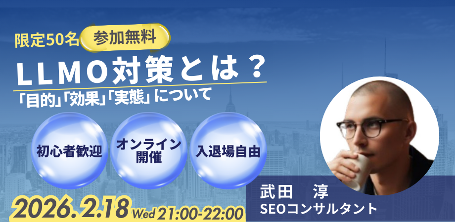 イベント詳細 AI時代の新戦略「LLMO」の実態を数字と事実から紐解く対談セミナー。SEOとの関係性やWebメディア・ライターの今後の在り方を徹底解説。「AIに仕事が奪われる」不安を払拭し、生き残るスキルを提示します。
