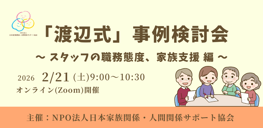 イベント詳細 当法人では、理事長、渡辺裕子が家族看護の領域で開発した「渡辺式家族アセスメント/支援モデル」をさまざまな職種の支援活動に普及させたいと、月1回、12回シリーズで模擬事例を用いた「事例検討会」を開催しています対人支援職ならばどなたでもご参加いただけます。どうぞお気軽にお申込みください。ご参加をお待ちしております。◆2026年2月21日・概要スタッフの職務態度、家族支援職場スタッフの職務態度とその家族への対応