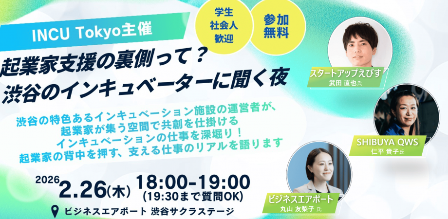 2026年2月26日(木)、渋谷エリアの3つのインキュベーション施設の運営が集い、起業家支援の裏側をじっくり語っていただくイベントを開催します。 参加無料&学生・社会人どなたでもO... powered by Peatix : More than a ticket.