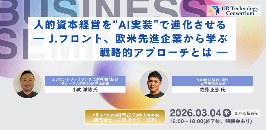 イベント詳細 本年3月以降の人的資本開示の新ルール施行により、経営戦略と人財投資の連動性が厳格に問われる時代が到来する。今やAIは単なる業務効率化の手段ではなく、企業価値を左右する「経営アセット」となっている。本会では、組織開発を専門領域として、J.フロント リテイリングでHRに携わる小向氏を招き、HR領域におけるAI活用の可能性と、組織・人材へのインパクトについて講演いただく。その後、General Assemblyより欧米企業で主流の「Human-led, AI-assisted」思想を紹介し、海外企業のHR領域で実施しているAI for HR講座の知見をもとに、人が主導しAIが補助する活用の考え方や、リスクを踏まえた教育のあり方を共有する。さらに、参加者同士のディスカッションを通じ、共通課題や日本独自の課題を掘り下げながら、開示の先にある「持続的な企業価値向上」につながるAI活用の道筋を、共に描き出す。セッション終了後には、参加者同士の軽食を交えた交流の機会を提供する。