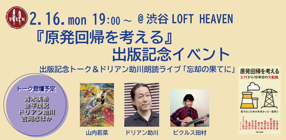 2月16日(月)、日本ペンクラブは集英社から、新書『原発回帰を考える』を出版します。当日、渋谷のLOFT HEAVENで出版イベントを開催することになりました。お申込みは渋谷LOF... powered by Peatix : More than a ticket.
