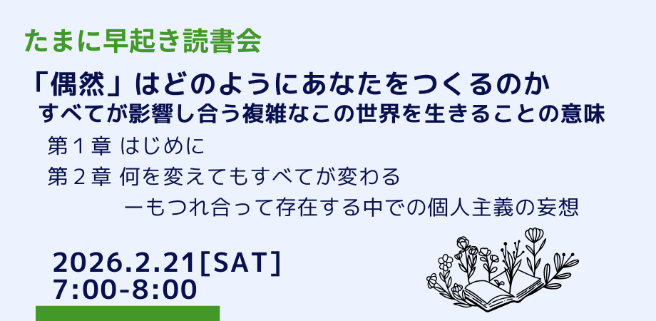 週末の朝を有意義に気持ちよく過ごせたらいいなと思い、たまに土曜の早朝に読書会を開催しています。 <開催概要>日時:2026年2月21日(土)7:00 ~ 8:00 課題本:「偶然」... powered by Peatix : More than a ticket.
