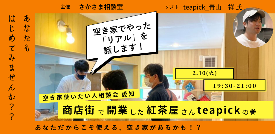 ① オープニング(5分)あいち空き家活用さかさま相談室について② ゲストトーク(15分)ゲスト:teapick・青山さん(空き店舗で事業運営を行う実践者)内容:空き家でお店をやってよかったこと・リアルな苦労など