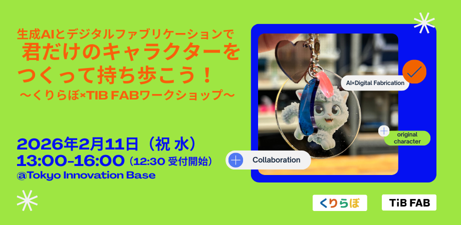生成AIとデジタルファブリケーションで君だけのキャラクターをつくって持ち歩こう!~くりらぼ×TIB FABワークショップ~開催日時:2026年2月11日(水・祝) 13:00~16:00(12:30 受付開始)会 場:Tokyo Innovation Base (東京都千代田区丸の内3-8-3)※1階『SQUARE-2』と 2階『TIB FAB』の両方を使って実施します。受付は1階です。対 象:都内在住または在学の小学4~6年生 (2013年4月2日〜2016年4月1日生まれの方)