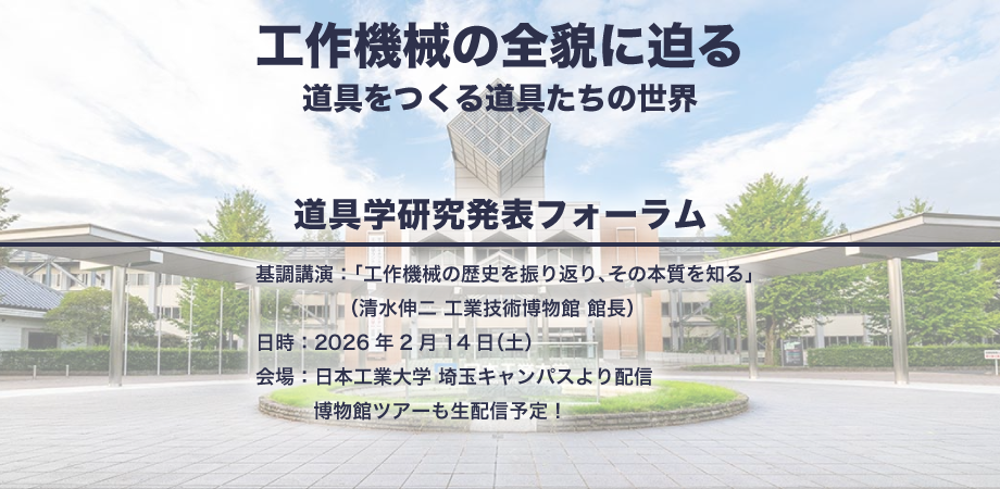 日本工業大学は、「実工学教育」を基本理念に掲げ、実践的技術者を育てることを教育目標としています。そのような理念のもと設置されたのが「工業技術博物館」です。この博物館の館長である清水伸二教授による基調講演を中心に、学芸員のご案内による博物館見学を行います。工作機械(機械のマザーマシン)を目のまえにし、「道具をつくる道具たち」から、日本の工業技術の原点を探ります。さらに、恒例の会員による「口頭研究発表」での道具学ディスカッションを企画しています。