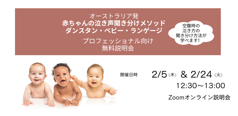 ダンスタン・ベビー・ランゲージは、オーストラリア発の赤ちゃんの泣き声聞き分けメソッドです。新生児ケアや両親サポートに関わる専門家の方々を対象に、無料説明会を開催いたします。当日は、DBLメソッドで聞き分けができる5つの音のうち、空腹の泣き方の聞き分け方をご紹介します。