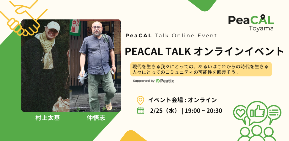 全国の地域イベントやコミュニティを支援する「PeaCAL」によるトークシリーズ PeaCAL Talk。 今回はPeaCAL Toyamaと共同で、地域に根ざした表現活動とコミュニティのあり方を探るオンラインイベントを開催します。